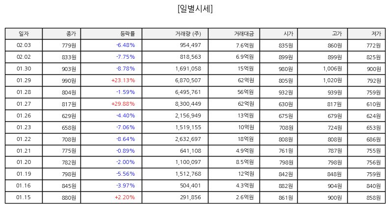 ▷ 단기적으로는 하락 추세 속에서 변동성이 확대된 구간에 위치해 있다. 장중 저점 부근에서 매수와 매도가 반복되며 방향성을 찾지 못하는 모습이다. 향후 거래량 증가와 함께 이전 가격대 회복 여부가 중요하며 해당 구간을 회복하지 못할 경우 추가 조정 가능성도 배제하기 어렵다. 반대로 수급이 안정되고 거래량이 동반된 반등이 나온다면 단기 기술적 반등 흐름은 기대해 볼 수 있다.