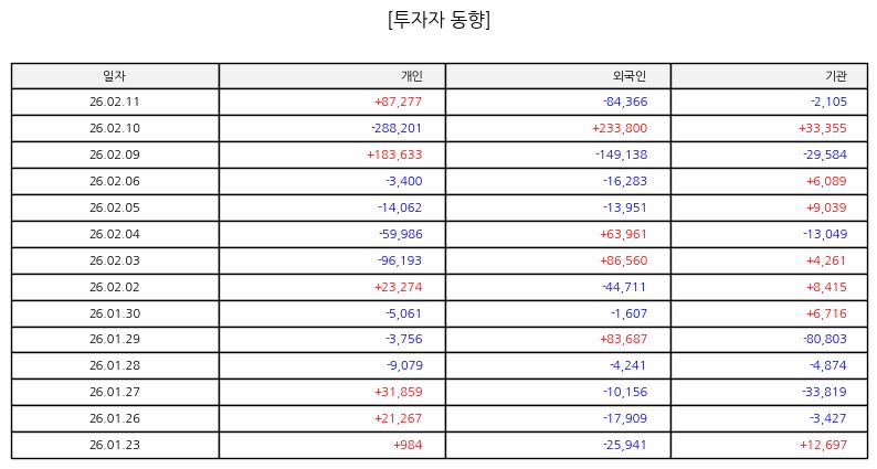 ▷ 금일 시가는 전일 대비 하락 출발하였으며 장중 낙폭이 확대되는 흐름을 보였다. 오전 한때 저점을 형성한 뒤 일부 반등 시도가 있었으나 종가 기준 약세 마감하였다. 거래량은 전일 대비 증가하며 매도 우위의 수급 구조가 나타났다. 기술적으로는 단기 지지선 이탈 여부가 관건이며, 하단에서의 거래량 동반 반등이 확인될 경우 단기 기술적 반등 가능성이 존재한다.