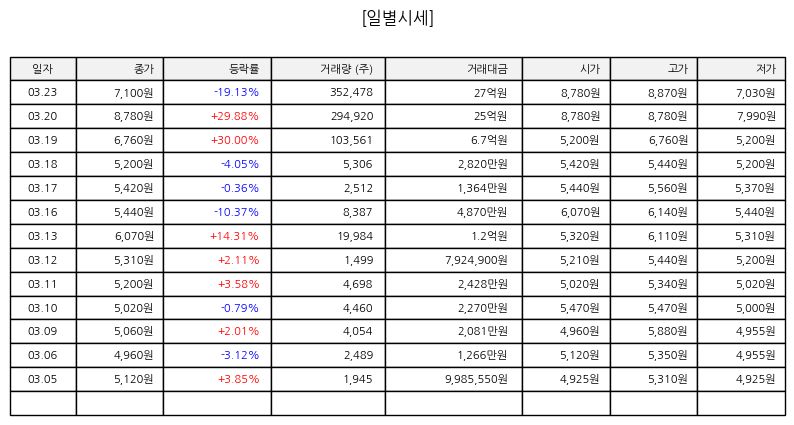 ▷ 금일 종가 13450원 기준으로 전일 대비 약 12퍼센트 하락 마감하였다 장 초반 상승 시도 이후 매도 물량이 집중되며 지속적인 하락세를 보였고 거래량은 전일 대비 증가하며 투자심리 위축이 확인되었다