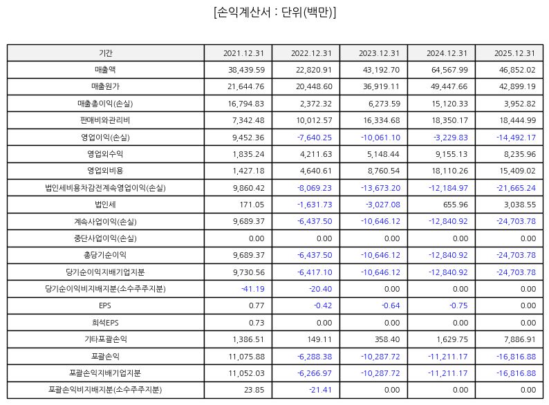 다만 재무적으로는 아직까지 적자가 지속되고 있다는 점은 부담 요인이다. 최근 몇 년간 영업이익과 순이익 모두 적자를 기록하고 있으며, 부채비율 상승 역시 리스크 요인으로 작용하고 있다. 따라서 이번 주가 급등은 펀더멘털보다는 수급과 기대감이 반영된 결과로 보는 것이 타당하다.