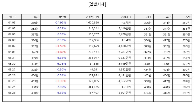 ▷ 2026년 4월 8일 기준 종가 250원 전일 대비 83원 하락 하락률 약 24.92퍼센트 시가 306원 고가 344원 저가 250원 거래량 약 158만주로 급증하며 장중 지속적인 하락세 기록